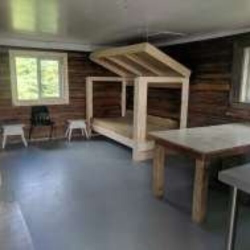 Cabin with group site (three tent pads) reservable at discovercamping.ca at $88/night/max. 16 people.